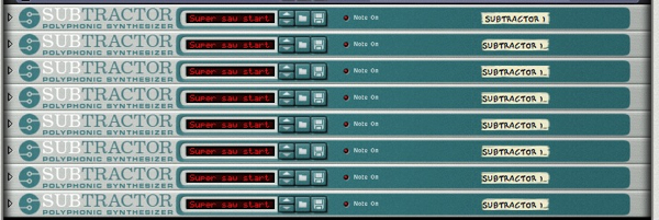 The initialised patch is loaded. Step 3: Duplicate the SubtractorThis is where things start to get heavy. Duplicate the Subtractor 8 times. Yes you heard me right, 8 times. This is the basis of the ‘SuperSaw’ effect and having 8 synths producing our saw waves will give us absolute and precise control over each part.