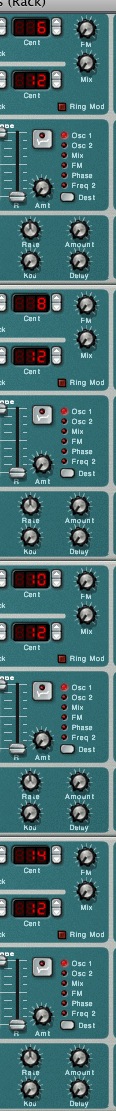 … And the second four using positives. Next up I activated all the synths on the mixer and panned them in stages, using a similar pattern to the tunings. So hard left to hard right in stages. As you can see in the screenshot…